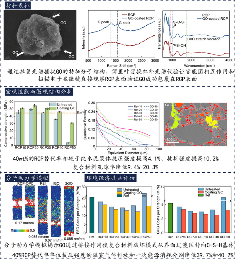为此,本项研究创新性地提出了利用氧化石墨烯(GO)包覆RCP颗粒的改性方法,优化RCP界面性能,以提高其在水泥基材料中的替代潜力。借助金属侵入、背散射电子成像与人工智能一体化分析手段开展研究,探明了硬化RCP-水泥基体的孔隙结构与GO包覆增强特征。研究结果证实,与纯水泥浆体相比,在40 wt%GO包覆RCP替代率下,复合材料孔隙率可降低9.4-20.3%,抗压强度和抗折强度分别提高了4.1%和10.2%。分子动力学模拟结果揭示GO通过裂纹桥联作用使RCP-水泥复合材料破坏模式从界面过渡区转向C-S-H基体。环境与经济效益分析结果表明40%替代率下单位抗压强度的温室气体排放和一次能源需求分别可降低约39.7%和40.2%。此项研究深化了对GO增强机制的理解,为RCP在环保型水泥基复合材料中的应用提供了一定的理论依据。高远团队长期致力于再生建筑材料的高性能化研究,在纳米改性、界面优化及低碳材料设计等方面取得了多项原创性成果,并承担了包括国家自然科学基金、江苏省自然科学基金在内的多项重点研究课题,为推动建筑行业的绿色低碳转型持续贡献力量。